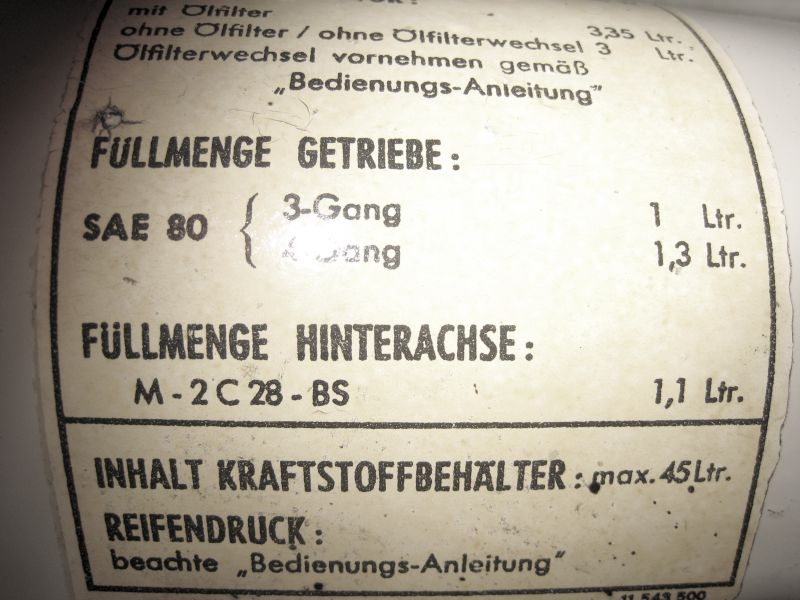 Hier der Aufkleber mit der Ölvorschrift, Original an meiner \'64er Wanne. Musste es auf 2 Bilder aufteilen, weil er ziemlich auf dem gebogenen Spritzwandteil klebt. Auf dem 3.Bild sieht man die Position, unterhalb des Haubenscharniers Beifahrerseite.