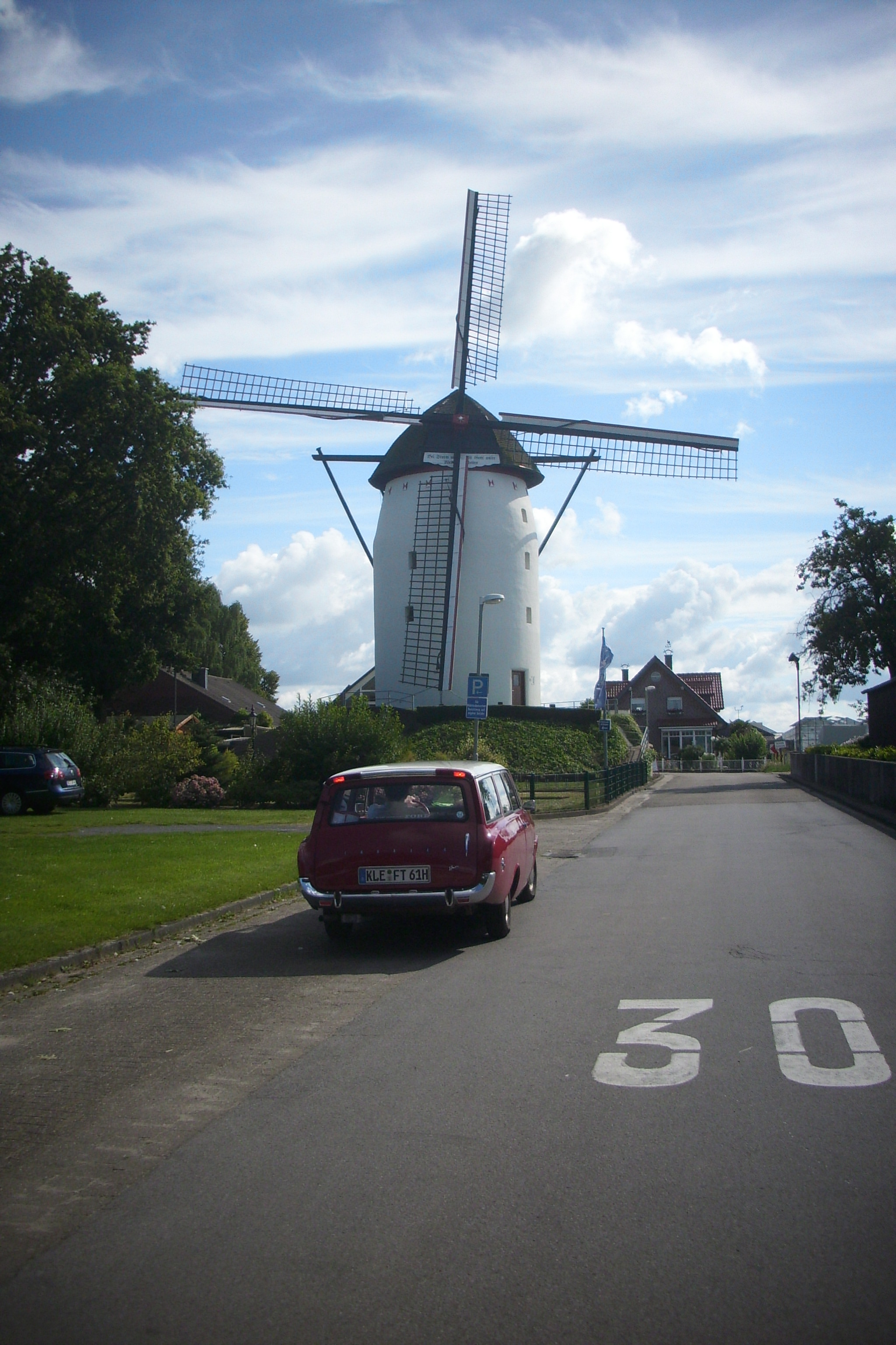 Über 50-Jähriger Ford neben ältesterer über 500-Jähriger noch funktionsfähiger Windmühle am Niederrhein